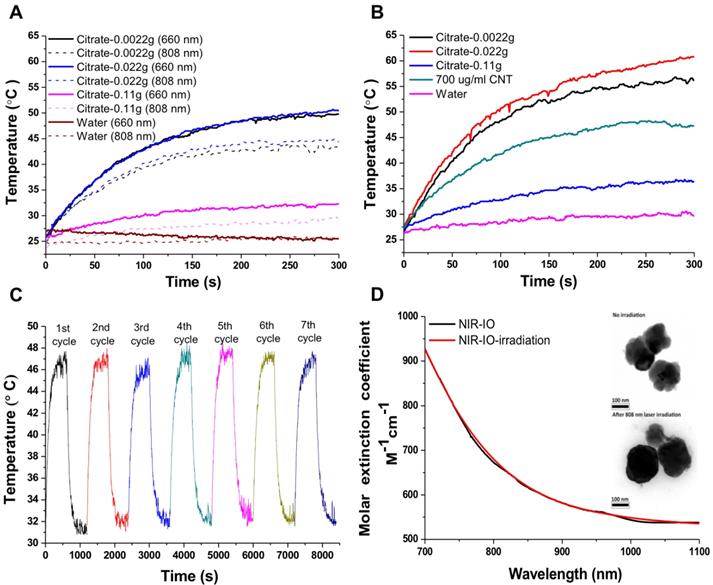 NIR-IO nanocrystal revealed 182.7 nm in hydrodynamic size with PDI 0.252 in water solution and less than 5% variation in hydrodynamic diameter of NIR-IO nanocrystals was measured after 15 days. Similar results were oberved in PBS solution (Figure S3). To evaluate the photothermal effect, suspensions of NIR-IO nanocrystals prepared with different amounts of citrate were irradiated with 808 and 660 nm lasers (0.2 W/cm2). Figure 4A shows that irradiation at 660 nm (dashed lines) produced a slightly larger temperature increase than irradiation at 808 nm (solid lines). This difference was due to the larger transition probability of 6A1 ↔ 4T2 of Fe+3 ions, shown by the fact that the ε values were higher at 660 nm than at 808 nm. However, for cancer therapy or other biomedical applications, longer irradiation wavelengths are preferred due to their better tissue penetration. Therefore, we further evaluated the photothermal ability of the particles using higher doses (1.5 W/cm2) of 808-nm laser irradiation. Water and CNT were used as controls and positive controls, respectively. As shown in Figure 4B, NIR-IO prepared with 0.022 g of citrate showed the highest temperature increase (from room temperature to 60 °C) with 808-nm irradiation, whereas no obvious temperature increase occurred in the water experimental group. Notably, a two-fold higher concentration of CNT at the same light dose only increased the temperature to 47 °C. This trend was also shown in the ε values (Table 1); the ε values of all the tested NIR-IO nanocrystals were higher than that of CNT (13.51 M-1 cm-1). When the citrate amount during synthesis was increased to 0.11 g, the highest temperature attained using the NIR-IO nanocrystals decreased from 60 °C to 35 °C. As shown in Table 1, the ε value of 75.63 M-1 cm-1 for NIR-IO nanocrystals prepared with 0.11 g citrate was lower than the value of approximately 650 M-1 cm-1 found for crystals prepared with 0.022 g citrate. The photothermal conversion efficiency of the crystals was also investigated, as in previous reports[54, 55]; the details conversion efficiency are provided in the Supporting Information. The resulting estimate of the photothermal conversion efficiency of NIR-IO nanocrystals was 21.2%. This value exceeds that of many materials currently used in PTT, such as indocyanine green (15.1%)[56], commercial gold nanoshells (13%)[57] and Fe3O4@Cu2-xS nanoparticles (16%)[58], and it is comparable to that of Cu2-xSe nanocrystals (22%)[57], commercial gold nanorods (21%)[57], fabricated Fe3O4 cluster-structured nanocrystals (20.8%)[59], and polypyrrole-coated gold metal balls (24%)[60]. The NIR-IO nanocrystals also displayed rapid heating capability due to their high photothermal conversion efficiency (41%), as indicated by the time required to reach 90% of their highest temperature. These results not only demonstrated that NIR-IO nanocrystals have more potential as a promising PTT agent than indocyanine systems but also showed that NIR-IO nanocrystals have an ability similar to that of gold nanorods to serve as PTT agents due to their similar photothermal conversion efficiency. In the evaluation of photostability of NIR-IO nanocrystals, the curves of temperature raising were no obvious change after seven repeated laser irradiation cycles (light dose of 1 cycle is 1 W cm-2, 600 s) (Figure 4C). The results of TEM and absorption spectrum also showed no obvious change in the morphology and optical property of NIR-IO nanocrystals via seven cycles of laser on/off (Figure 4D). Photostable issue in several photothermal agents such as gold nanorods was previous reported. Zhou et al. showed the gold nanorods obvious decrease in the curves of temperature raising and optical property via laser irradiation with lower light dose (1 cycle is 0.38 W cm-2, 600 s). The morphology of gold nanorods also changed after laser irradiation [26]. Thus, our prepared NIR-IO nanocrystals have excellent photostability for biomedical applications.